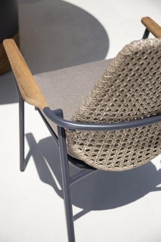 CLARA’s signature design elements are rooted in a perfect blend of comfort, craftsmanship, and elegance. The chair features a weather-proof Viennese style wicker shell back, providing both support and style. Its teak armrests, uniquely shaped, contrast beautifully with the sleek aluminum frame, creating a sophisticated silhouette.