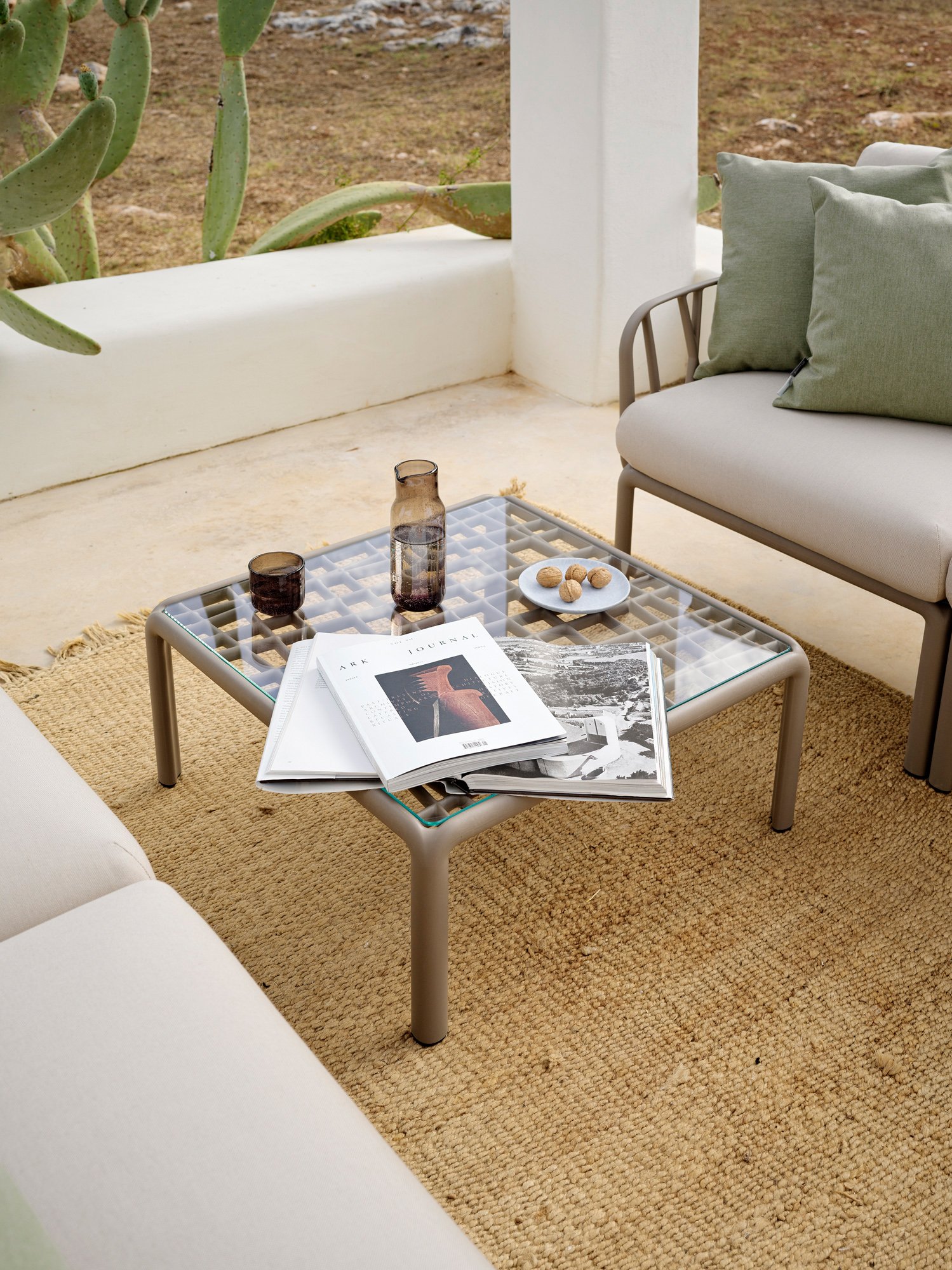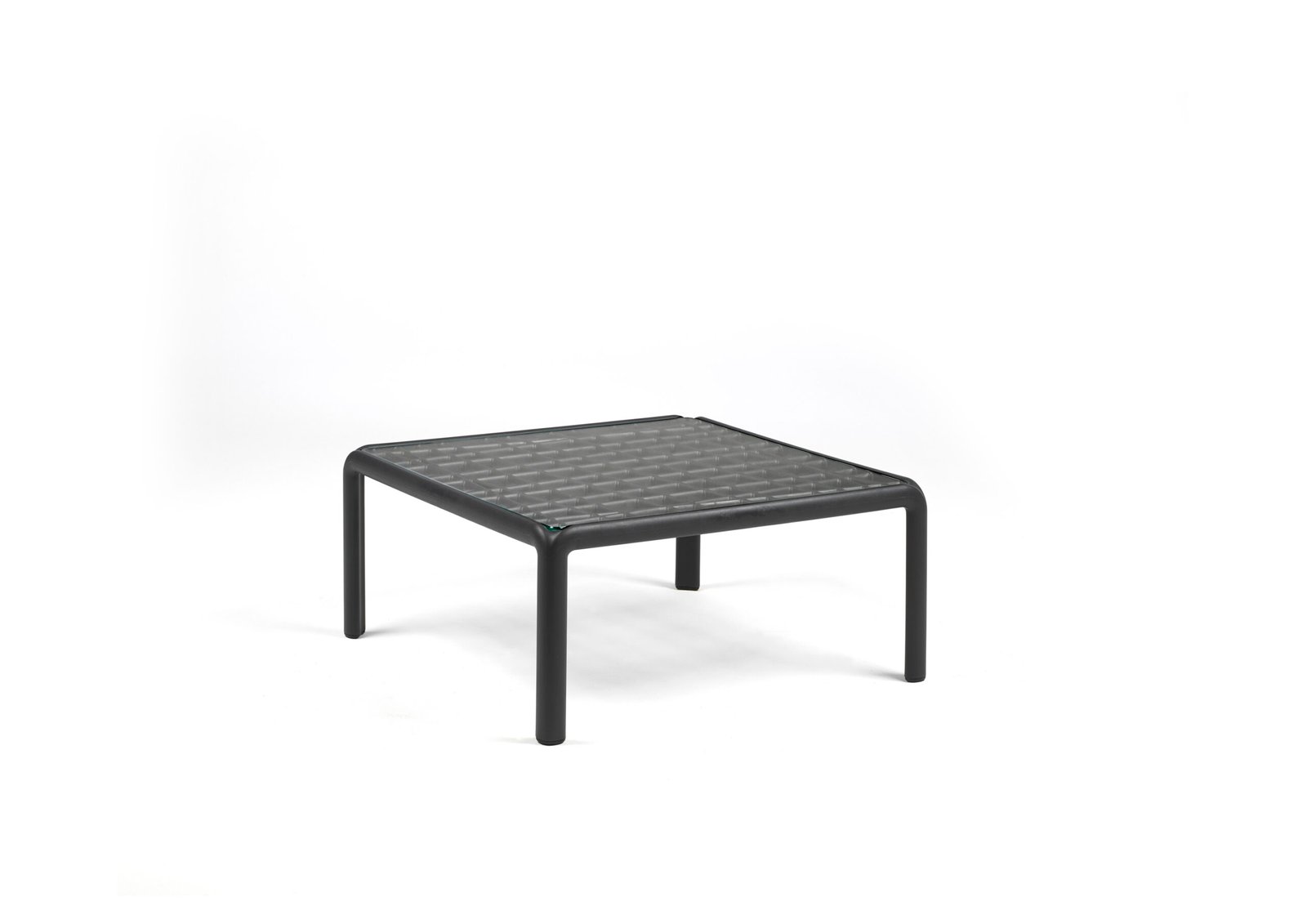 Side table. Material: frame is of uniformly colored fiberglass polypropyleneresins with UV additives. Matt finish. Top in extra-clear tempered glass. With non-slip feet. Recyclable resin.