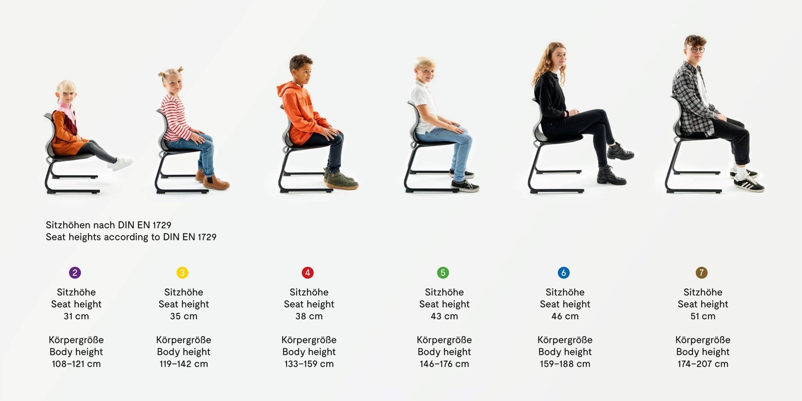 That should be obvious, one would think. When chairs are put up for the cleaning crew, many damage the tabletop, which is frustrating. The C frame in the Flötotto PRO series is equipped with a tabletop guard. In addition, it has an extremely robust seat shell which allows for ergonomic, 360° sitting. The C frame is available in six sizes in accordance with DIN EN 1729 – from size two to seven. The colour code on the frame makes it easier to match it with the sizes and simplifies variable use at changing locations.